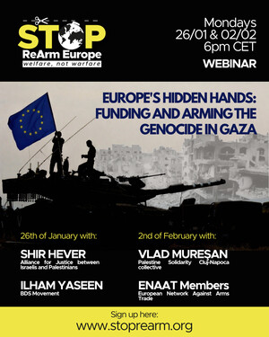 This series of two webinar will explore the European complicity with the Israel’s genocide in Gaza and its decades-long military occupation of Palestine in particular through arms trade and strengthened military cooperation, including increased dependency from Israeli security and “battle-tested” technologies, and how resistance is growing and civil society is organising to challenge those policies.